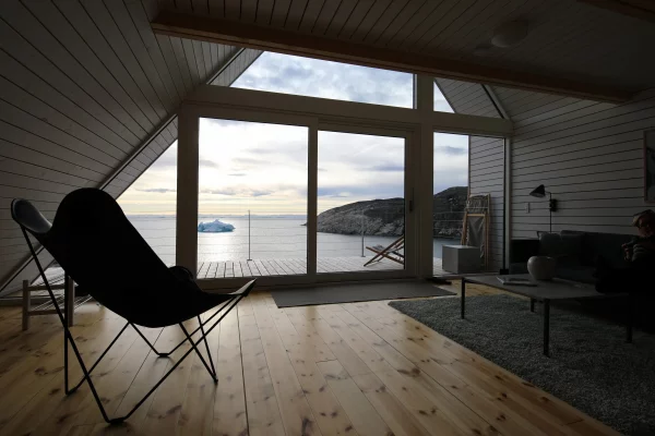 Øverst er der to senge, som fungerer enten som dobbeltseng eller twin-beds. I stueetagen findes en stilfuld opholdsstue med plads til afslapning og hvor man kan nyde udsigten. Det store vinduesparti fylder hele facaden ud mod havet og giver dig en smuk panoramaudsigt på begge etager. Der kommer jævnligt pukkelhvaler helt tæt på, ligesom isfjordens isbjerge driver forbi udenfor.