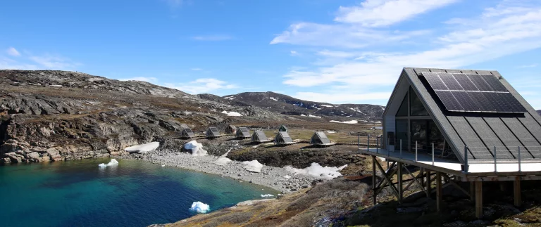Hver hytte er udstyret med egne solpaneler, som leverer energi til varme og el. Overskudsproduktionen af el fra solpanelerne sælges billigt til byen. Det betyder, at jo mere du sparer på vand og varme, desto mere bidrager du til at give noget tilbage til den lokale befolkning. De lange lyse dage og nætter i Grønland om sommeren bidraget til en effektiv udnyttelse af solpanelerne.