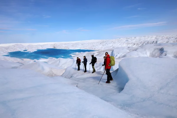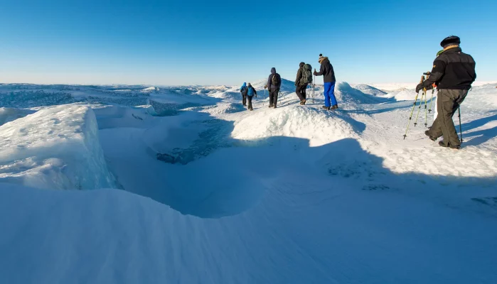 Kom op på indlandsisen, den nordlige halvkugles største iskappe og gå en tur ind over det prægtige snedækkede landskab. Der er hvidt så langt øjet rækker.